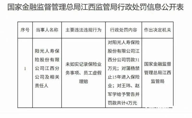 因两项业务违规,阳光人寿江西分公司被监管处以31万元罚款,相关责任人蒲杨因情节严重被禁止15年进入保险业。